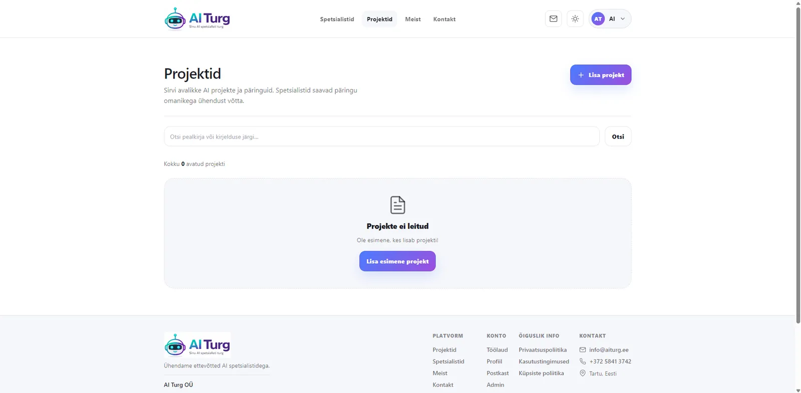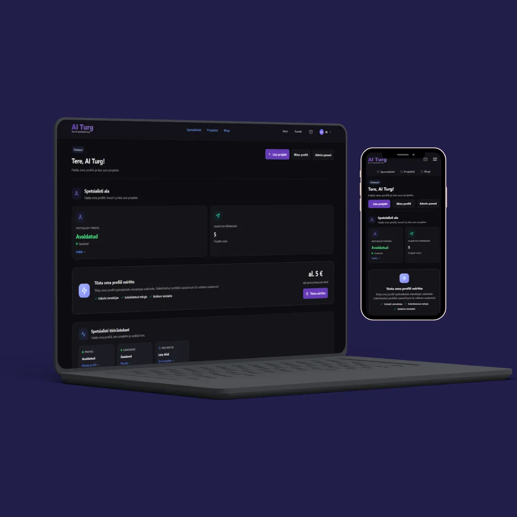 AI Turg on spetsialiseeritud portaal, mis viib kokku ettevõtted ja AI valdkonna spetsialistid. Platvormi eesmärk oli luua selge, usaldusväärne ja skaleeritav keskkond, kus saab postitada projekte, sirvida profiile ning leida kiiresti sobiva AI partneri. Lahendus ühendab kaasaegse kasutajakogemuse, läbimõeldud sisustruktuuri ja tehnilise paindlikkuse, et toetada platvormi kasvu nii Eestis kui ka rahvusvahelisemalt.